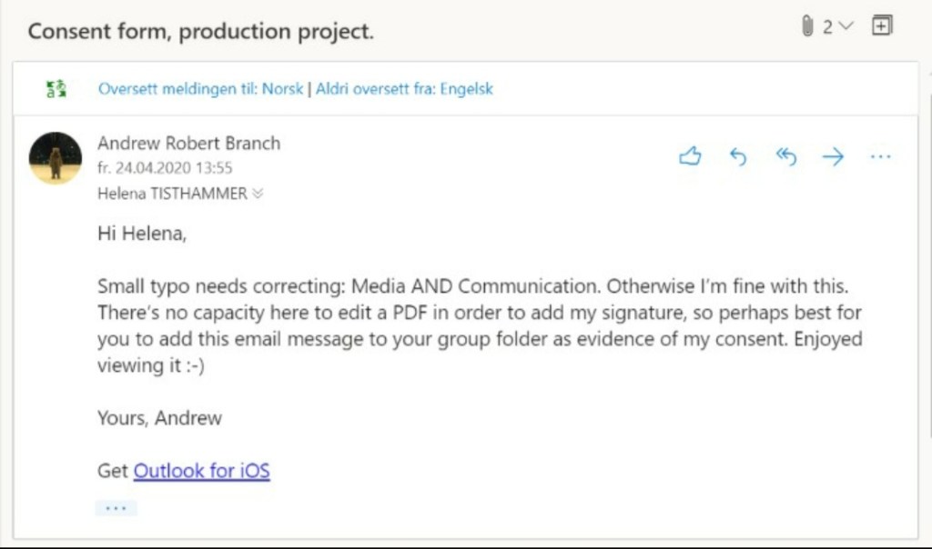 Our interviewee Andrew Branch was unable to sign the concent form for technical reasons, however has given us email concent instead.